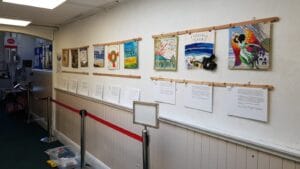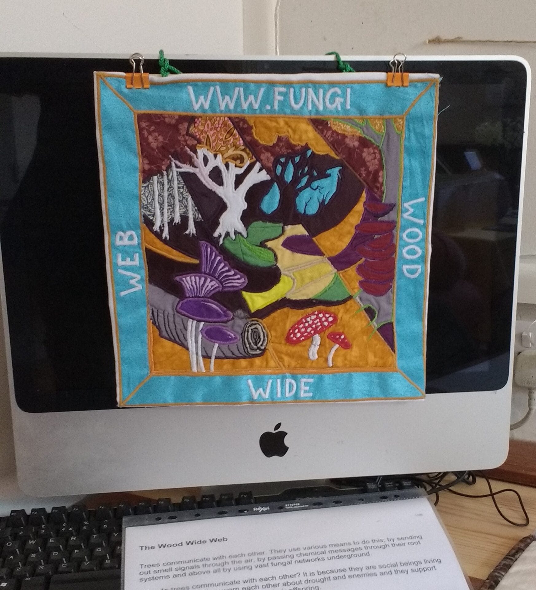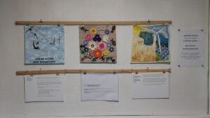 There’s a preview of some of the Loving Earth Panels in the Corridor gallery up until end of April. Worth having a look each time you are in the Old School because we have a diversity of panels on loan and there will be some swapping around! Some are going back to Loving Earth to be displayed at a venue in France. Each panel is a unique expression of someone’s love and care for the earth and there’s a wide range of environmental themes as well as styles of textile art.