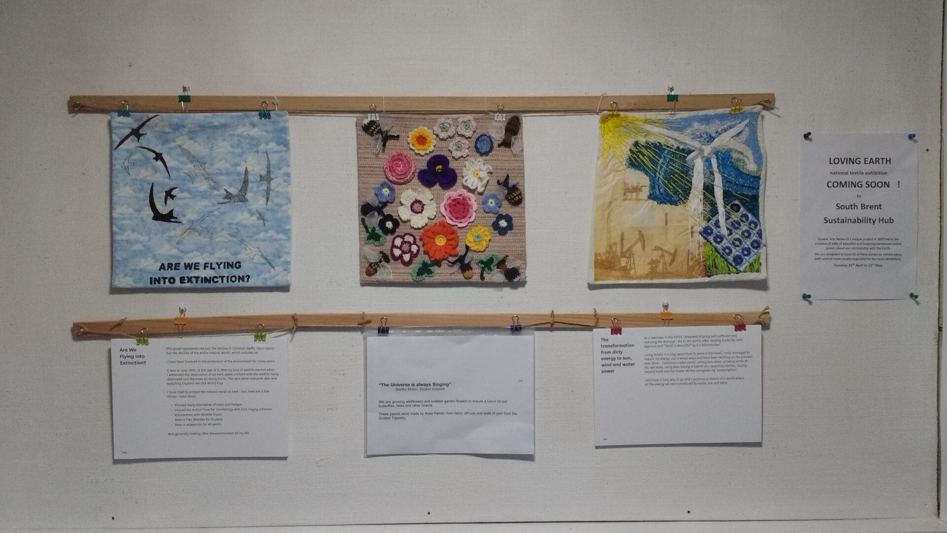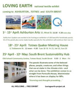 25 April to 12 May 2023: Loving Earth Project National Textile Exhibition. Open Monday – Friday; 9.30am-2pm in the Sustainability Hub at the Old School Community Centre. Handmade textile panels illustrating some of the beloved places creatures and other things that are at stake in the climate crisis – and what can be done. See: https://lovingearth-project.uk/event/lep-exhibition-at-sustainable-south-brent-sustainability-hub/.