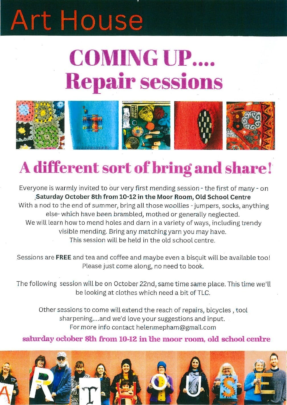 Saturday 22 October 2022: A Stitch in Time, Repair Cafe – The second of The Art House’s ‘Stitch in Time’ Repair Cafés from 10am-12noon in the Old School Community Centre. This time the session will be looking at clothes that need a bit of TLC, which we will learn how to mend in a variety of ways! Just come along – no need to book – and it’s free!