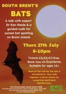 Thursday 27 July 2023: Bats of South Brent: 8-10pm. Meet at the SSB Hub at the Old School Community Centre at 8pm for an introductory talk and refreshments, and then we’ll head together to Brent Island around sunset for some guided bat spotting with our resident expert, Dr Ken Neale.