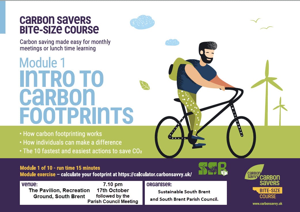 Monday 17 October 2022: Carbon Savers Bite-size Course – module 1: Introduction to Carbon Footprints at the Pavilion, Palstone Park Recreation Ground at 7.10pm (preceding the monthly Parish Council meeting). Carbon Saving made easy in ten monthly meetings offering everything you need to know to cut your footprint and raise your wellbeing. The first 15- film minute session shows how carbon footprinting works; how individuals can make a difference; the 10 fastest & easiest actions to save CO2. Calculate your carbon footprint from https://calculator.carbonsavvy.uk/.