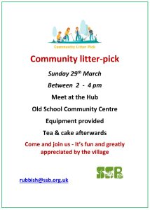 Join SSB’s South Brent Litter Pickers at the Hub at the Old School Community Centre at 2pm. Equipment is provided as is tea, cake and conversation in the Hub afterwards!