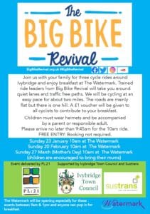 Sunday 23 January, Sunday 20 February; Sunday 27 March (Mother’s Day) 2022: Family Cycle Rides around Ivybridge. Join PL21 with your family at 10am at The Watermark, Ivybridge for a cycle ride around Ivybridge and enjoy breakfast at The Watermark. Trained ride leaders from Big Bike Revival will take you around quiet lanes and traffic free paths. We will be cycling at an easy pace for about 2 miles. The roads are mainly flat but there is one hill. A £1 voucher will be given to all cyclists to contribute to your breakfast. Children must wear helmets and be accompanied by a parent or responsible adult (children are encouraged to bring their mums). Please arrive no later than 9:45am for the 10am ride. Free Entry: Booking not required. The Watermark will be opening especially for these events between 9am & 1pm and anyone can pop in for breakfast. Part of Cycling UK’s Big Bike Revival programme, delivered by PL21 and supported by Ivybridge Town Council and Sustrans.
