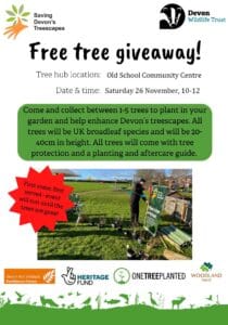 This ‘tree hub’ day is being run by Sustainable South Brent with the trees provided by Devon Wildlife Trust. It is part of the wider ‘Saving Devon’s Treescapes’ partnership which is a response to the impact of Ash Dieback disease. The trees will all be small nursery transplants 20-40cm tall, each provided with a cane and spiral guard as well as a planting and aftercare guide.
