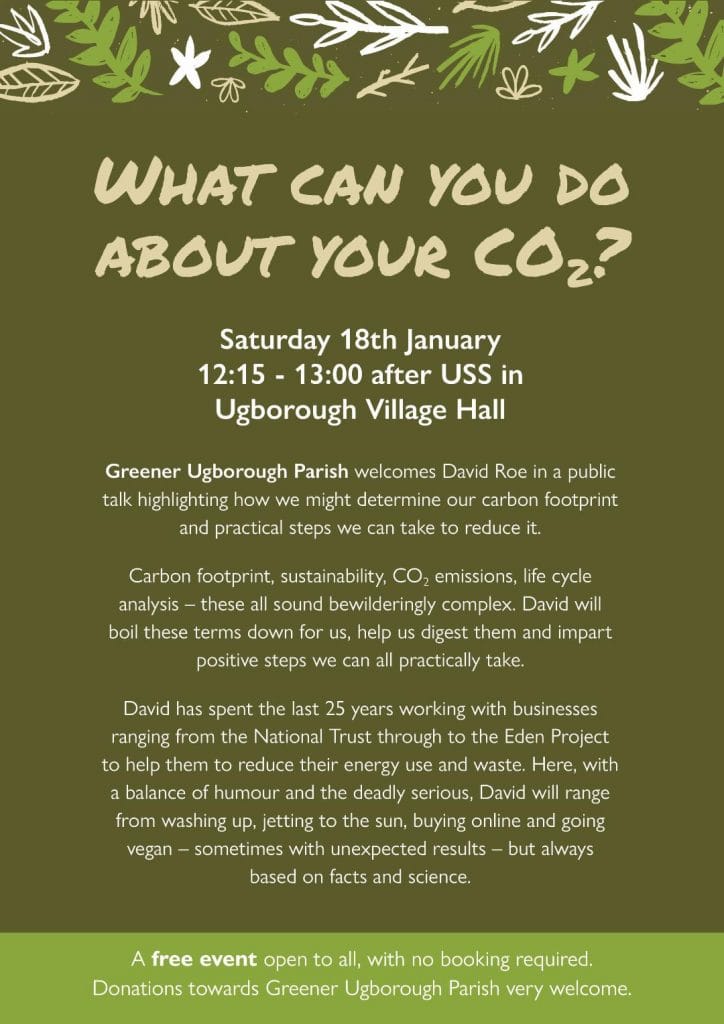 Saturday 18 January 2020: What can you do about your CO2?’ in Ugborough Village Hall from 12.15-1pm, after Sustainable Saturday. Greener Ugborough Parish welcomes David Roe in a public talk highlighting how we might determine our carbon footprint and practical steps we can take to reduce it. Carbon footprint, sustainability, CO2 emissions, life cycle analysis – these all sound bewilderingly complex. David will boil these terms down for us, help us digest them and impart positive steps we can all practically take. David has spent the last 25 years working with businesses ranging from the National Trust through to the Eden Project to help them to reduce their energy use and waste. Here, with a balance of humour and the deadly serious, David will range from washing up, jetting to the sun, buying online and going vegan – sometimes with unexpected results – but always based on facts and science. A free event open to all, with no booking required. Donations towards Greener Ugborough Parish very welcome.