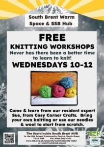 Free Knitting Workshops from 10am-12 noon in the HUB and Warm Space in the Moor Room at the Old School Community Centre. Never has there been a better time to learn to knit! Come & learn from our resident expert, Sue, from Cosy Corner Crafts. Bring your own knitting or use our needles & wool to start from scratch.