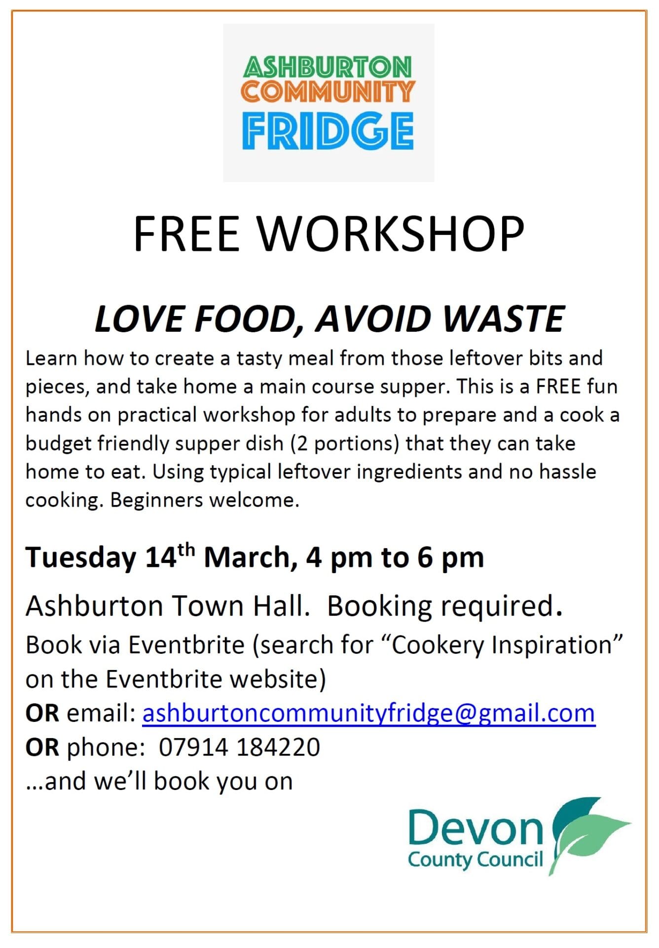 Advance booking required – either via Eventbrite www.eventbrite.co.uk/e/cookery-inspiration-love-food-avoid-waste-free-workshop-tickets-511789134077 OR email: ashburtoncommunityfridge@gmail.com OR phone: 07914 184220.