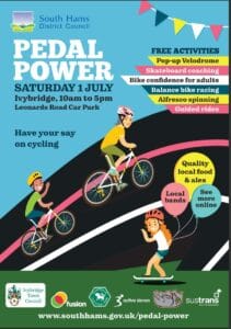 Saturday 1 July 2023: Pedal Power Activities and Events from 10am-5pm in Leonards Road Carpark, Ivybridge. An exciting, free, fun-filled, action packed cycle activity day, aimed at the whole family, promoting the benefits of active travel in the South Hams.
