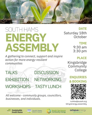 Saturday 18 October 2025: South Hams Energy Assembly: 9:30am-3:30pm at Kingsbridge Community College, Balkwill Road, Kingsbridge TQ7 1PL. (https://what3words.com/whistling.glares.blazers)