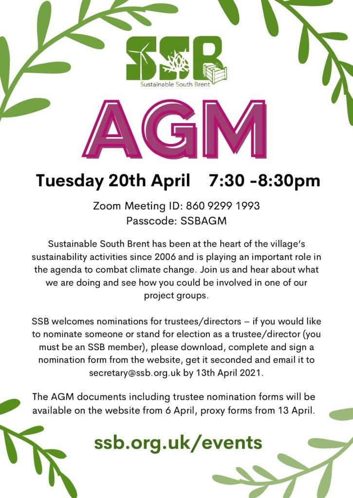 Tuesday 20 April 2021: Sustainable South Brent’s Annual General Meeting will take place via Zoom at 7.30pm. Sustainable South Brent has been at the heart of the village’s sustainability activities since 2006 and is playing an important role in the agenda to combat climate change. Join us and hear about what we are doing and see how you could be involved in one of our project groups.