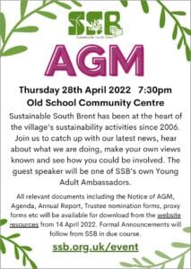 Thursday 28 April 2022: Sustainable South Brent’s Annual General Meeting  at the Old School Community Centre at 7.30pm. Formal Announcements will follow from SSB in due course. Sustainable South Brent has been at the heart of the village’s sustainability activities since 2006 and is playing an important role in the agenda to combat climate change. Join us to catch up with our latest news, hear about what we are doing, make your own views known and see how you could be involved in one of the project groups. The guest speaker will be one of SSB’s own Young Adult Ambassadors.