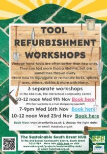 Tool Refurbishment Workshop: 1-Tool Sharpening Special with Harry Jennings in Sustainable South Brent’s new Sustainability Hub at the Old School Community Centre. Learn how to sharpen anything from shears and scissors, to axes, hoes, knives, wood chisels, and more. Sharpening using files, stones and other abrasives. Bring something you would like to sharpen, or choose a practice piece. Bring gloves if you can.